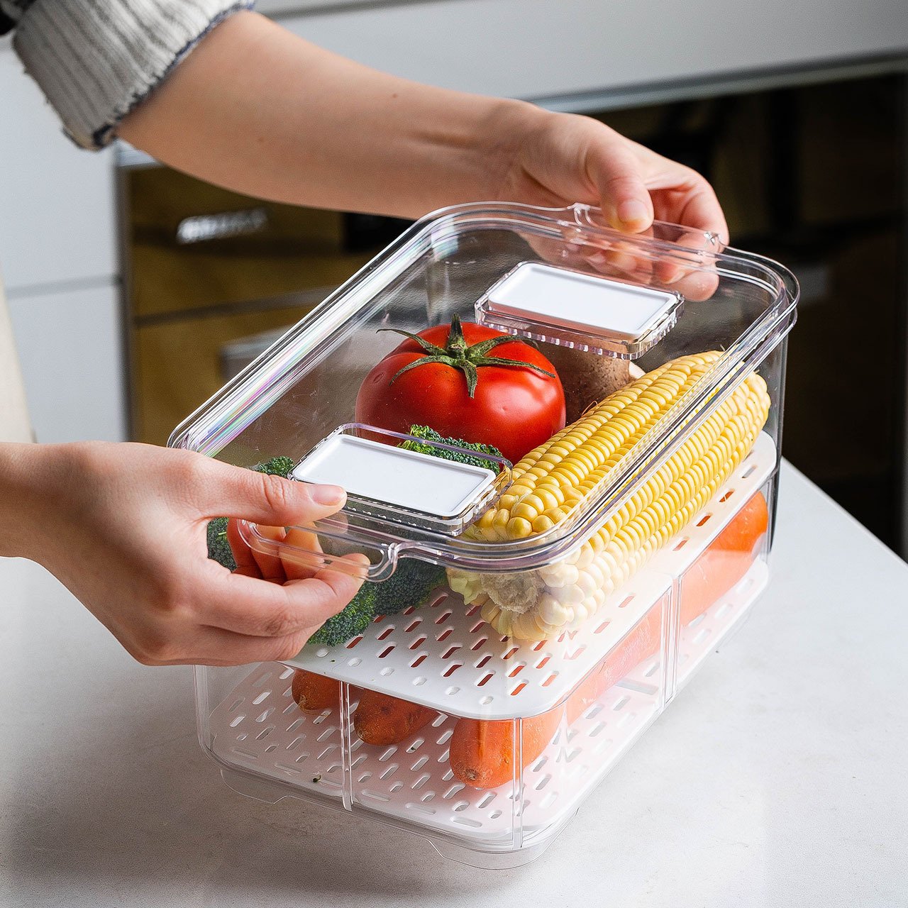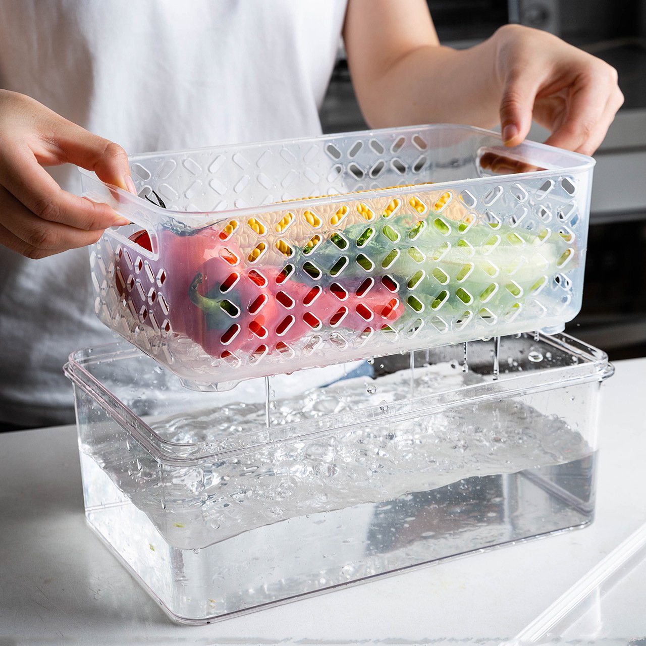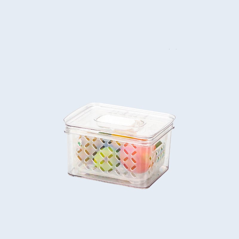 Crafted from food-grade PET and PP materials, this box is not only safe and environmentally friendly, but it also boasts a large capacity to accommodate all your storage needs. The top ventilation feature ensures optimal airflow, while the built-in drainage board helps keep your food items dry and fresh.
