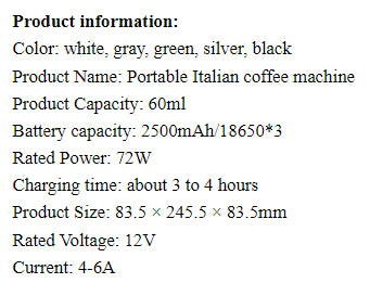 This product has a 15Bar golden pressure, can be fully charged and extracted 50 times, has a battery capacity of 3 * 2500mAh, and can reach a water temperature of 95 degrees.